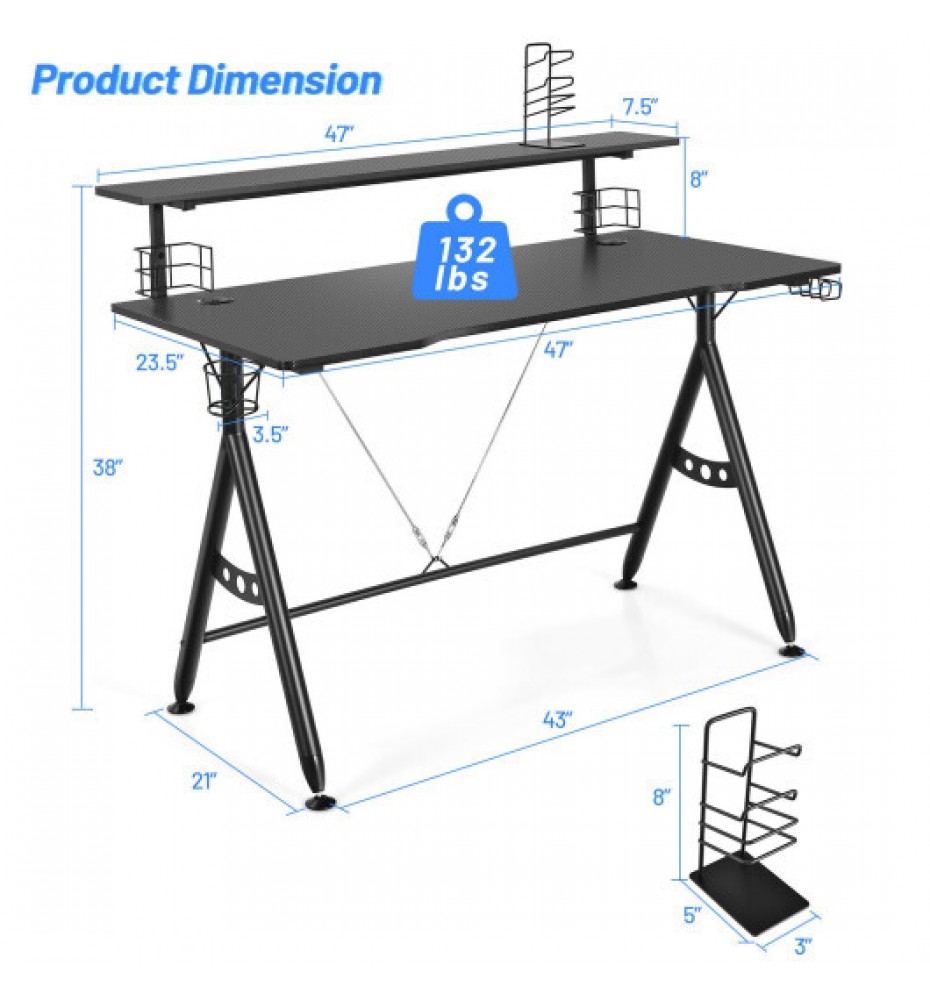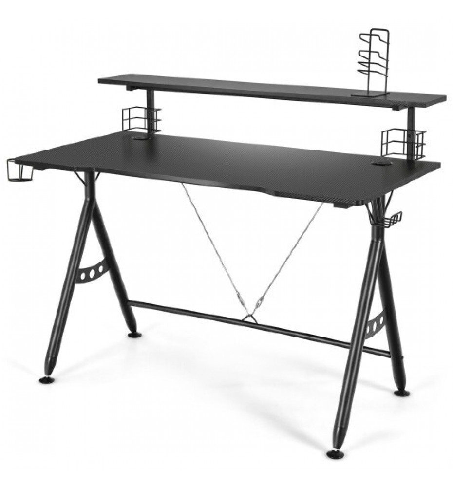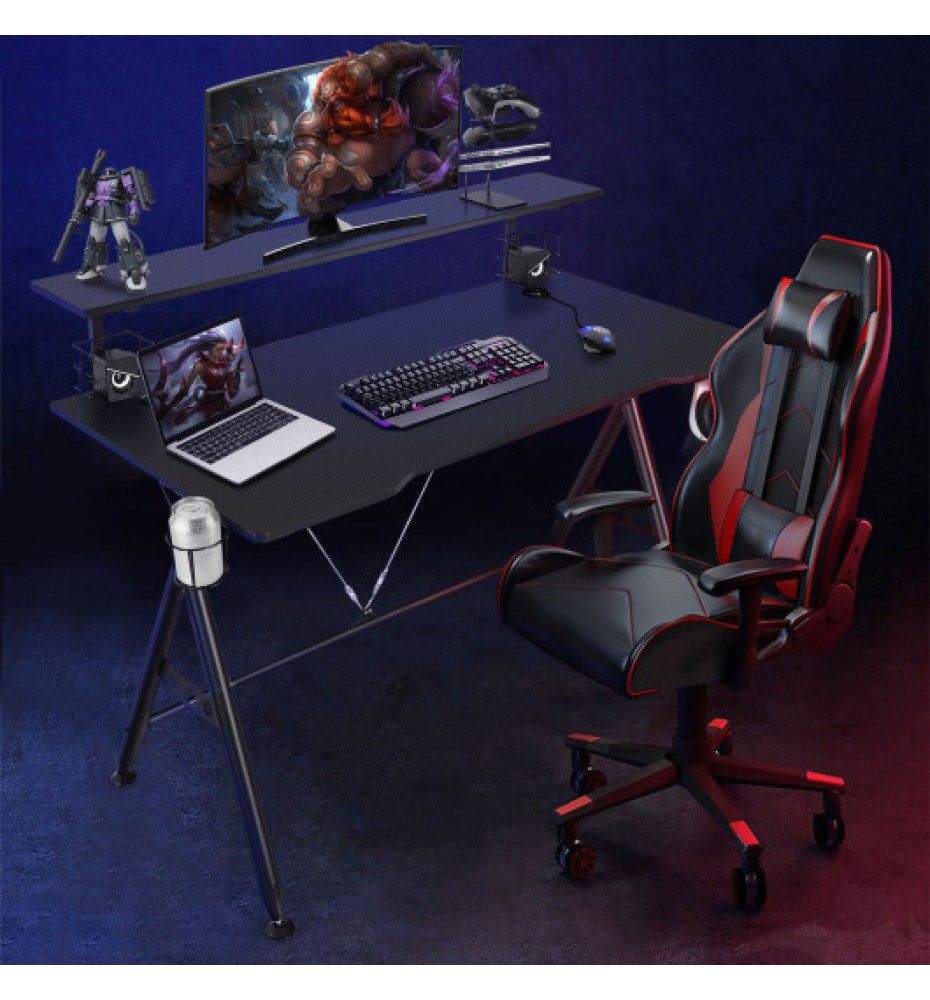 The desktop is wide enough for you to put computer monitors books keyboards plants and other small items on it without crowding. The Y-shaped table legs plus adjustable foot pads are rather sturdy to avoid the table from wobbling or shaking during your gaming time. This gaming table is equipped with a gaming handle rack headphone hook cup holder and 2 speaker stands allowing you to put everything you need at hand and keep your desktop tidy. Additionally there are 2 cable management holes to keep your cables well organized and neat. The carbon fiber textured playing surface is smooth skin-friendly wear-resistant and easy to clean. This multifunctional desk can be used as a computer desk study desk home office desk or gaming table.