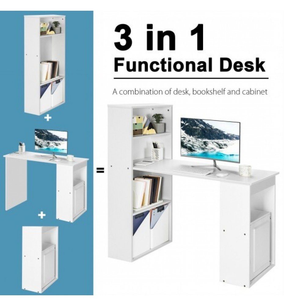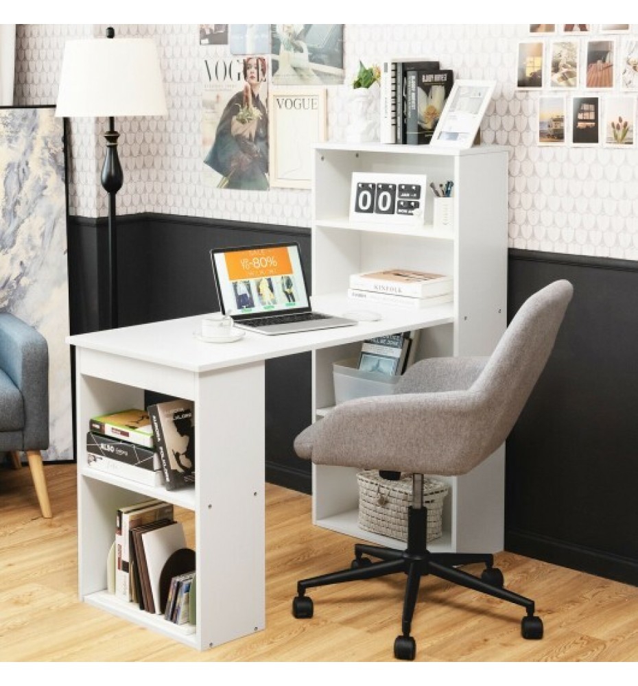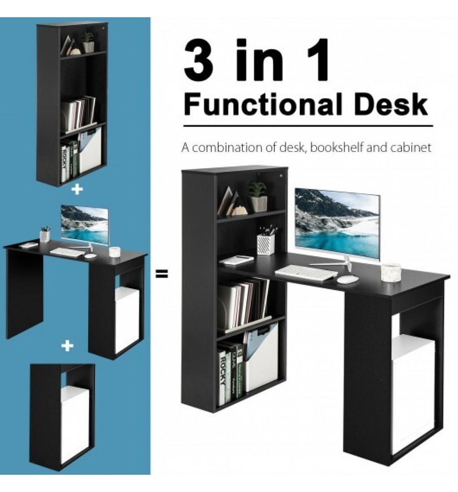 Specifications: Color: Black/Natural/White Material: Engineered Wood + MDF Overall Dimensions: 48" x 22" x 48" (L x W x H) Tabletop Dimensions: 48" x 20" (L x W) Tabletop Height: 29.5" Shelf Size (2-Tier Side): 17" x 9" x 11" (L x W x H) Upper Shelf Size (4-Tier Side): 20" x 8" x 9" (L x W x H) Lower Shelf Size (4-Tier Side): 20" x 8" x 13.5" (L x W x H) Net Weight: 61 lbs Weight Capacity of Tabletop: 201 lbs Package Includes: 1 x Computer Desk with Bookcase 1 x Instruction