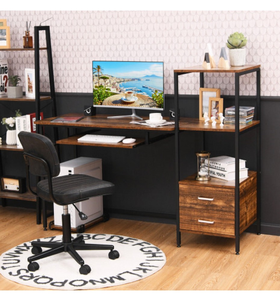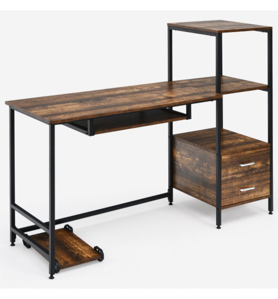 Specifications: Specification Color Rustic Brown Material Steel Engineered Wood MDF PVC Overall Dimension 55.5" x 20" x 44" (L x W x H) Keyboard Size 21.5" x 12" x 3" (L x W x H) CPU Stand Size 16" x 9.5" (L x W) Drawer Height from Ground 4.5" Tabletop Height from Ground 29.5" First Bookshelf Size 18" x 16" (L x W) Second Bookshelf Size 16" x 16" x 13" (L x W x H) Third Bookshelf Size 18" x 14" x 12.5" (L x W x H) Drawer Handle Length 4" Drawer Dimension 14" x 11.5" x 5.5" (L x D x H) Weight Capacity of Desktop 176 lbs Weight Capacity of Keyboard Tray 33 lbs Weight Capacity of Each Drawer 33 lbs Weight Capacity of Each Shelf 33 lbs Weight Capacity of CPU Stand 33 lbs Net Weight 61 lbs