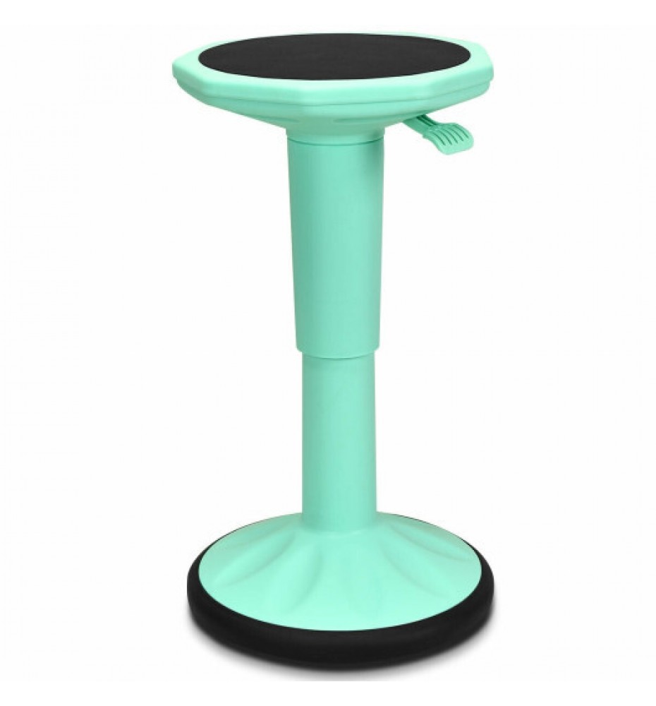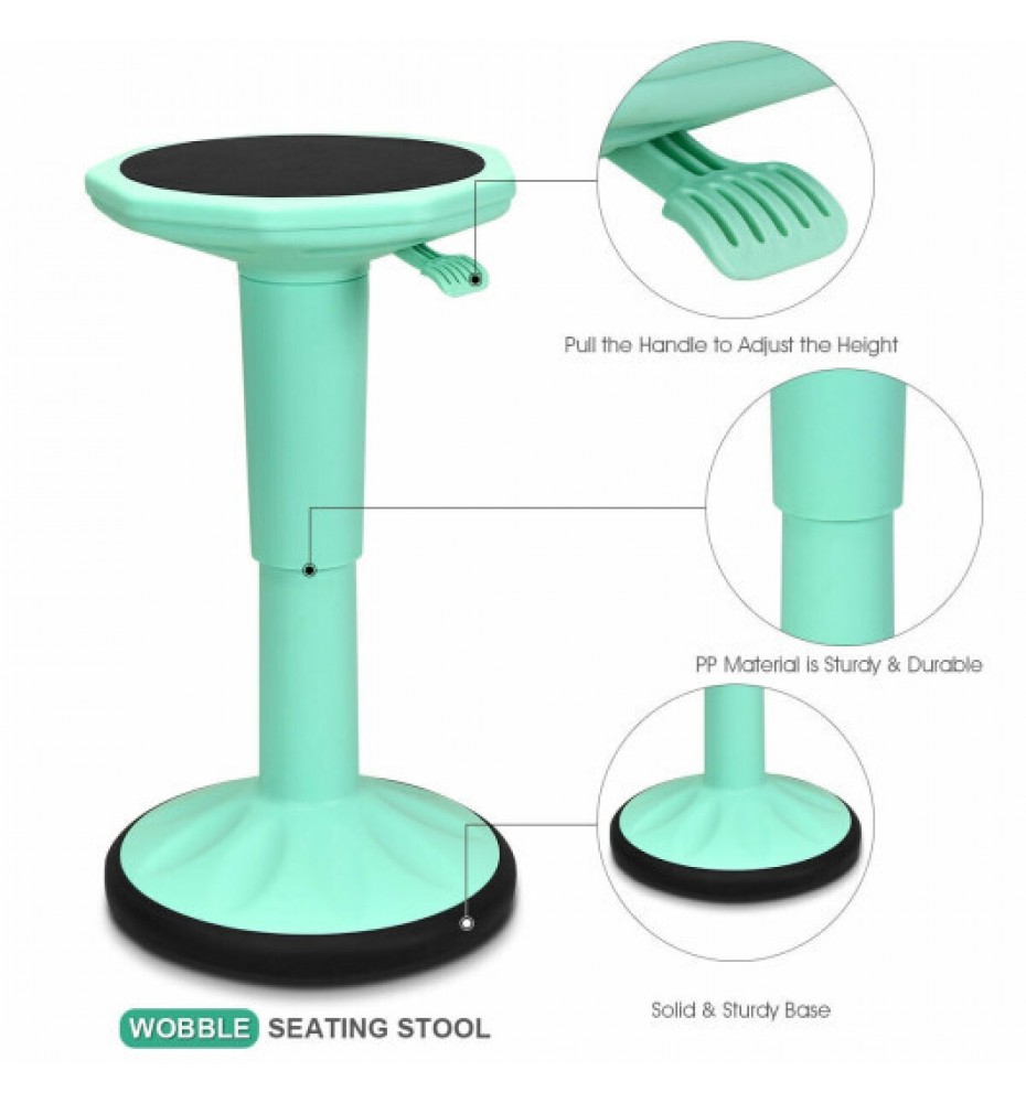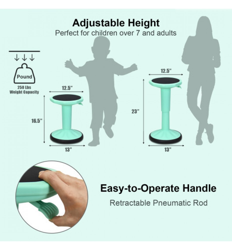 Specifications: Color: Mint green Materials: PP silicone material Product size: 13" x 13" x 16.5"-23" (L x W x H) Net weight: 10 lbs Max loaded weight: 250 lbs Minimum adjusting weight: 66 lbs Package includes: 1 x Wobble seating stool