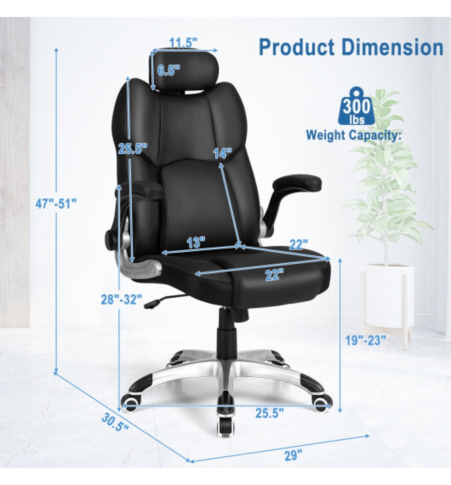 Specifications: Color Black Materials Leather Sponge Plywood Nylon PU Product Dimension 29" x 30.5" x 47-51" Size of Seat 22" x 22" Size of Lumbar Cushion 14" x 13" Size of Headrest 11.5" x 6.5" Backrest Height 25.5" Armrest Height 28"-32" Seat Height 19"-23" Diameter of Base 25.5" Net Weight 38.5 lbs Weight Capacity 300 lbs