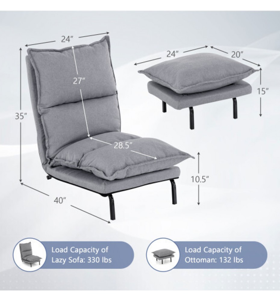 Specifications: Color Gray Material Faux Linen Fabric Metal Sponge PP Cotton Overall Dimension of the Chair 40" x 24" x 35" (L x W x H) Overall Dimension of the Ottoman 24" x 20" x 15"(L x W x H) Backrest Height 27" Seat Depth 28.5" Seat Cushion Height from the Ground 10.5" Load Capacity of Lazy Sofa 330 lbs Load Capacity of Ottoman 132 lbs Net Weight 24 lbs